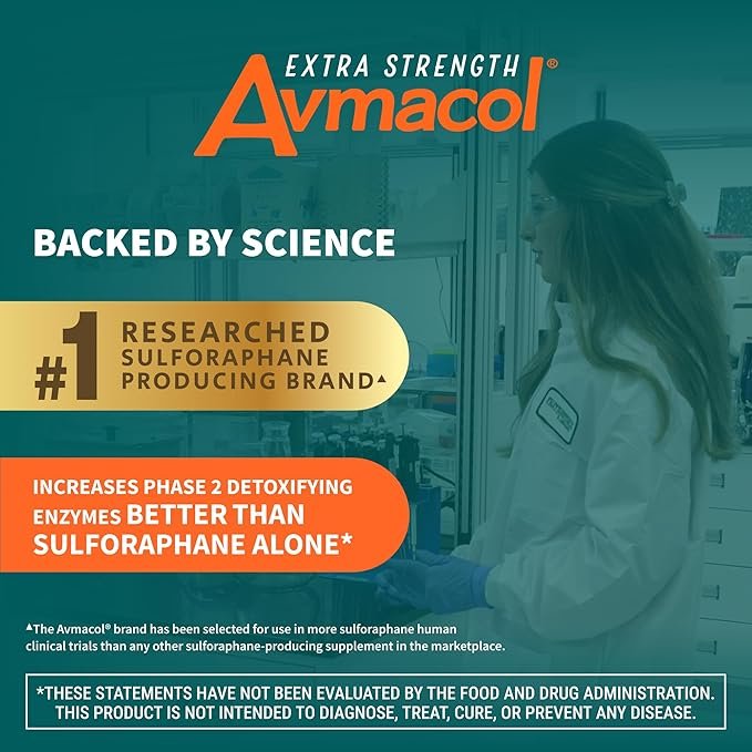 Avmacol Extra Strength is a patented sulforaphane-producing system designed to support the body’s natural detoxification processes and immune health. Unlike simple sulforaphane supplements,