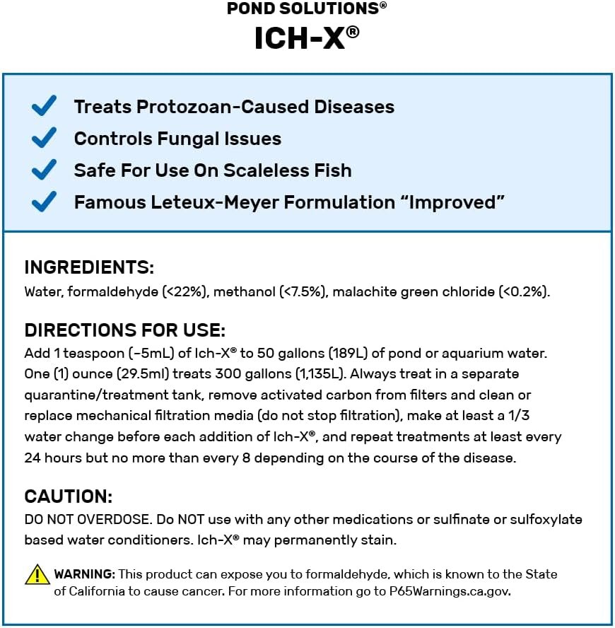 Hikari Ich-X is a potent liquid medication designed to treat “Ich” (white spot disease) and other external protozoan, fungal, and bacterial infections in aquarium fish.