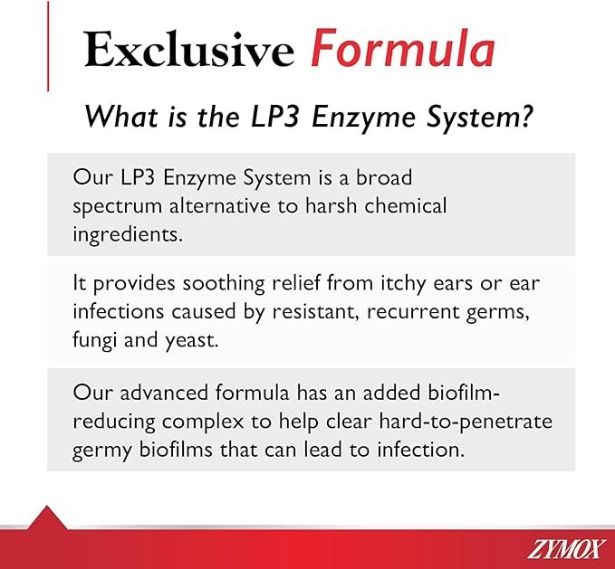 Zymox Advanced Formula Otic Plus is a veterinarian-trusted enzymatic ear solution specifically formulated to manage problematic ears in animals. This advanced system features the patented LP3 Enzyme System, which is engineered to penetrate deep into the protective biofilms of underlying bacteria, fungi, and yeast.